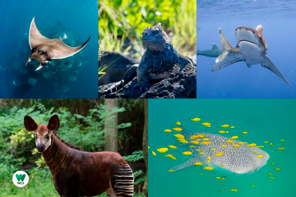 Estas son algunas de las especies que obtuvieron nuevas protecciones comerciales en la CoP20 de la CITES en Samarcanda. Todas estas especies se encuentran ahora en el Apéndice I. De arriba abajo/De izquierda a derecha: manta toro, iguana marina, tiburón oceánico de puntas blancas; okapi; y tiburón ballena.