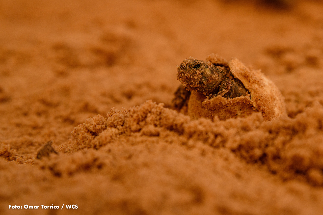 WCS trabaja junto con comunidades locales y gobiernos para proteger a la tortuga gigante del río Amazonas y su hábitat. Esta especie, la mayor tortuga de agua dulce de América Latina, puede llegar a medir 1.07 metros y pesar hasta 90 kilos. Además de su tamaño impresionante, cumple un rol ecológico fundamental: ayuda a dispersar semillas que regeneran la vegetación ribereña y aporta biomasa clave para la cadena alimenticia del ecosistema acuático.